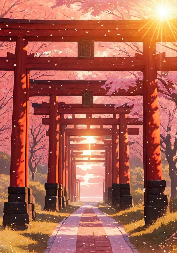 Bathed in golden sunlight, a pathway of red torii gates stretches endlessly into a forest alive with cherry blossoms. Petals fall like whispers of time, carpeting the ground in pink and white as they dance in the breeze. The radiant glow of the sun filters through the blossoms, illuminating the sacred passageway. Path of Blossoms symbolizes guidance, renewal, and the harmony of tradition with nature’s fleeting beauty.