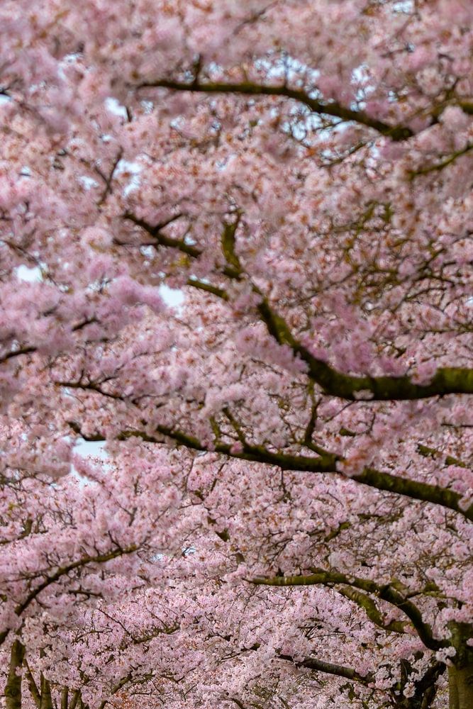 An avenue of Japanese flowering cherries photographed in April 2021 in the Bürgerpark of the Hanseatic city of Wismar. The avenue was planted in 1991 as a central element of the 1992 Wismar State Garden Show.