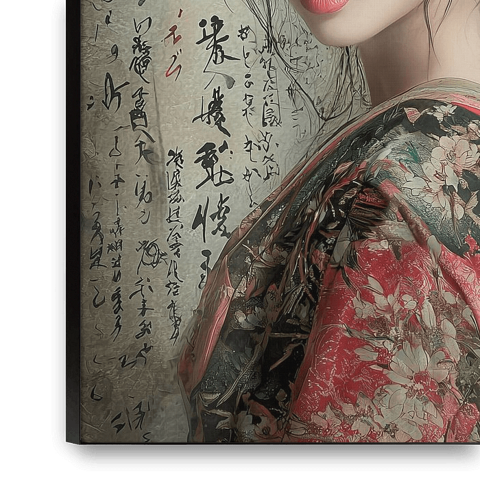 Portrait of a young woman in traditional dress against a vintage-style calligraphy background. The image gives a contemporary interpretation of ancient Japanese art forms through the use of artificial intelligence. This portrait was created using Ai.