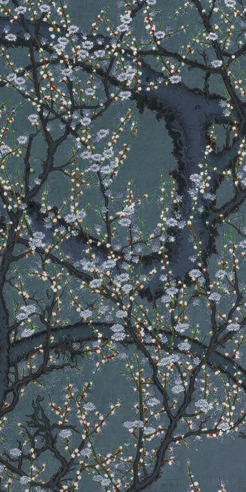 About "Japanese vintage print. Plum blossom at full moon in warm grey"