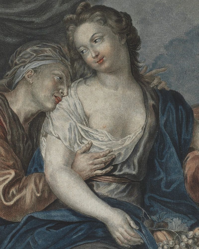 Here the man seduces the woman and the guy has his hand under the breast of the maid. The tit is naked so that the goddess is partly topless.