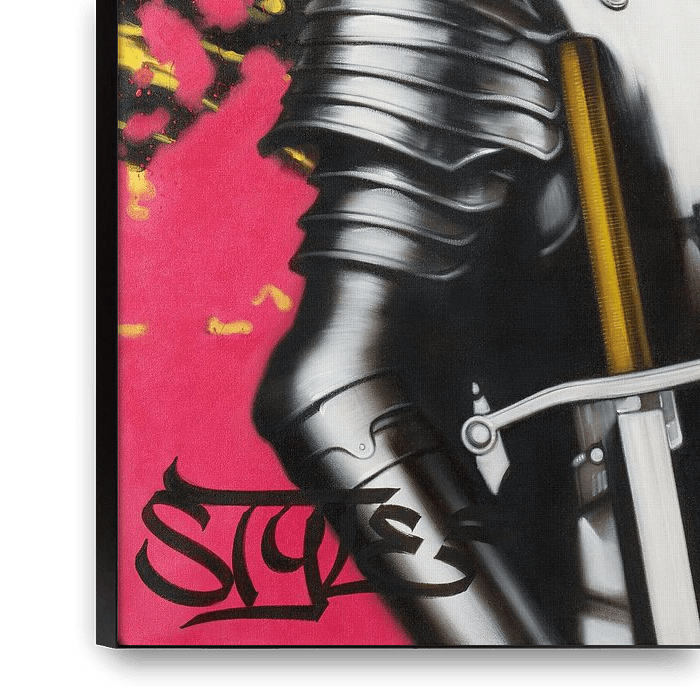 I wanted to revisit the figure of the knight by injecting it with a rebellious, contemporary attitude. The armour becomes a symbol of emancipation, the cigarette a gesture of insubordination. The word "UNREAL" underlines a heroine between myth and modernity, between strength and casualness.