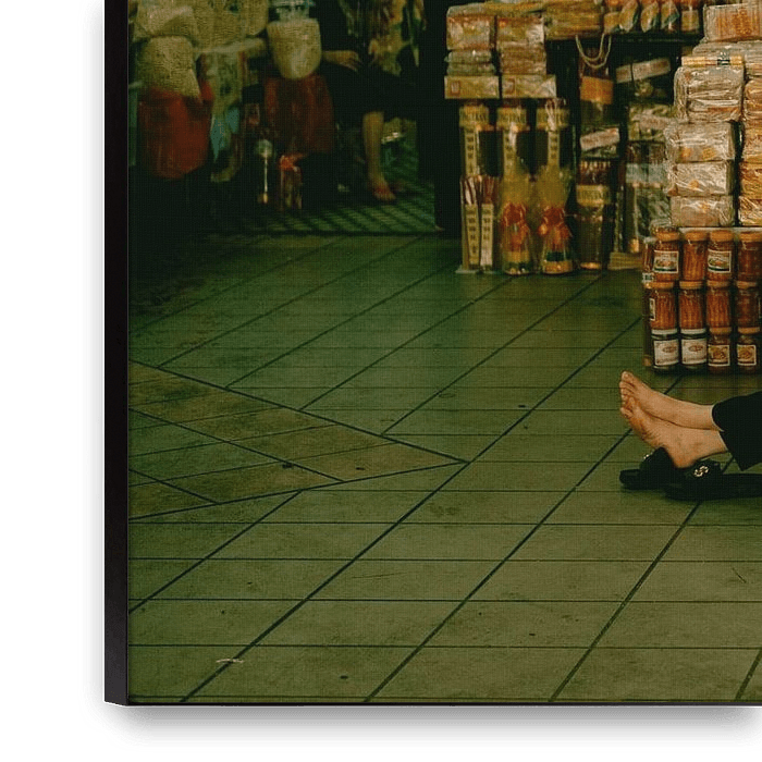 This picture authentically captures the lively atmosphere of a Vietnamese market, which can be found everywhere in Hanoi. The countless foodstuffs, snacks and colourful packaging are stacked up to the top row of shelves and symbolise the diversity of regional products in Southeast Asia. Traders sit relaxed on small plastic chairs,…