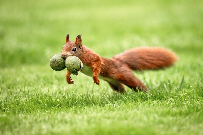 Jumping squirrel with two chestnuts in its mouth. by Frans Lemmens