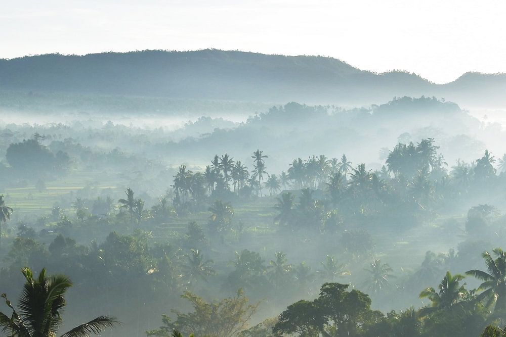 Photo of jungle and rice fields with Mount Agung in the background in Bali. Mist stretches across the fields. This creates beautiful lines in the landscape and hues. An idyllic vista and I was so lucky to witness it myself. Now it is a beautiful image making the green beauty of Bali to admire at home. Photography.