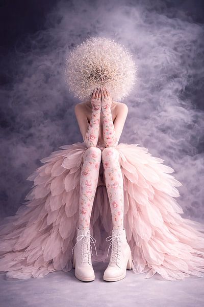 A girl wearing a pink skirt made of flower petals, white lace-up boots, tights and long gloves with pink flowers. She has a wilted dandelion for a head, symbolising a dreamy and airy quality. She holds her hands in front of her face, giving her a sad expression. The background is filled with mist, creating a mystical atmosphere. The…