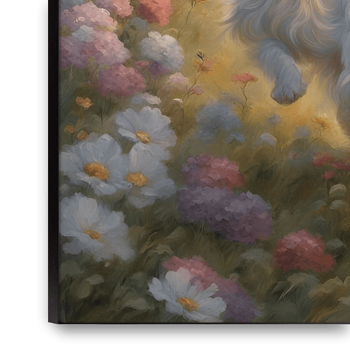 Buy this digital art artwork Kai Ken dog playing in a Flowerfield by Johannas Art Creations as a reproduction on canvas, ArtFrame, poster and wallpaper, printed on demand in high quality.