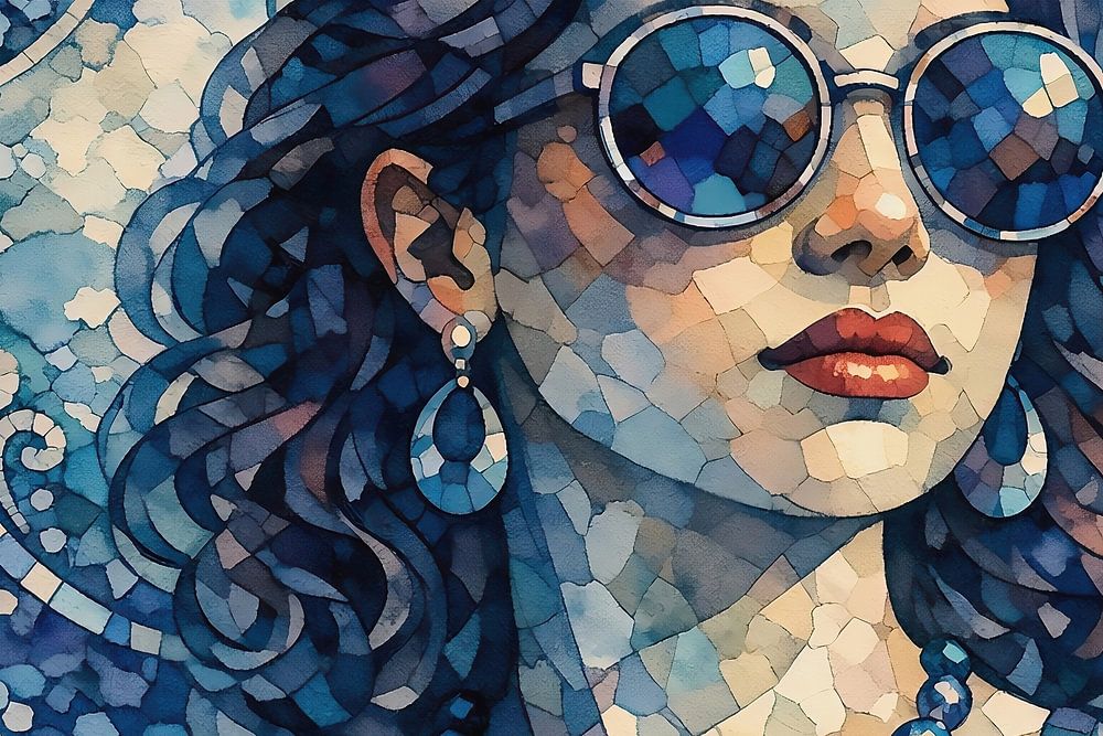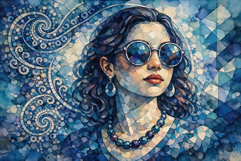 This abstract portrait, rendered in an alcohol ink style, depicts a woman enveloped in a play of cool blue tones, silver and white. Her face, partly fragmented into geometric shapes, radiates calm and self-assurance. The reflections in her silver-coloured glasses and jewellery catch the light like liquid crystals, whilst the background…