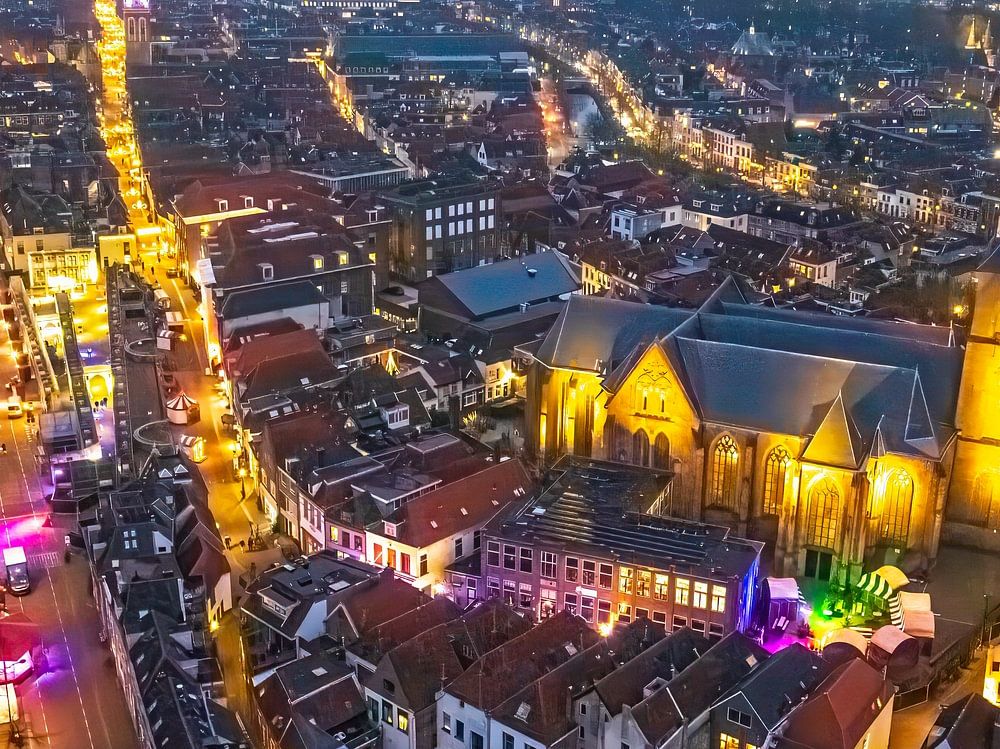 Evening panorama of the skyline with the Stadbrug and Nieuwe Toren of the city of Kampen in Overijssel, The Netherlands. The lights of the city are reflected in the calm water while clouds are moving over the city in the sky.