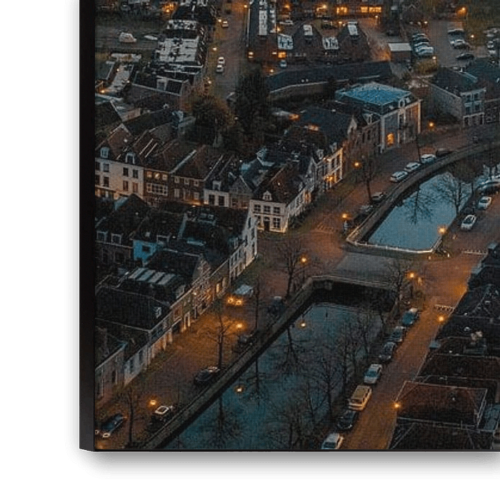 Kampen on the banks of the river IJssel during sunset seen from above with the Koornmarktspoort and Bovenkerk in the old town of Kampen during an autumn sunset. The koornmarktspoort is the oldest gate of Kampen located at the riverbank of the IJssel. The Bovenkerk or the Church of St. Nicholas is a large, Gothic church and the most striking element on the skyline of Kampen at the river IJssel in the Overijssel province.