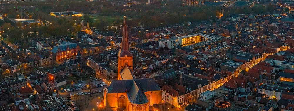 Kampen on the banks of the river IJssel during sunset seen from above with the Koornmarktspoort and Bovenkerk in the old town of Kampen during an autumn sunset. The koornmarktspoort is the oldest gate of Kampen located at the riverbank of the IJssel. The Bovenkerk or the Church of St. Nicholas is a large, Gothic church and the most striking element on the skyline of Kampen at the river IJssel in the Overijssel province.