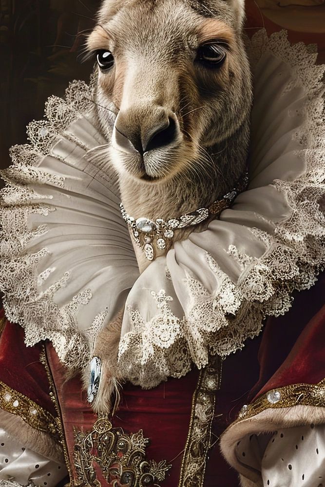 Behold the fascinating combination of animal grace and baroque splendour with this extraordinary work of art. A majestic kangaroo, clad in opulent robes and sparkling jewels, reigns regally over its kingdom. The detailed depiction of textures and colours lends this humorous portrait an incomparable elegance. Perfect for art lovers who appreciate a blend of creativity, humour and historical grace. This work of art is guaranteed to become the centrepiece of any stylish interior.