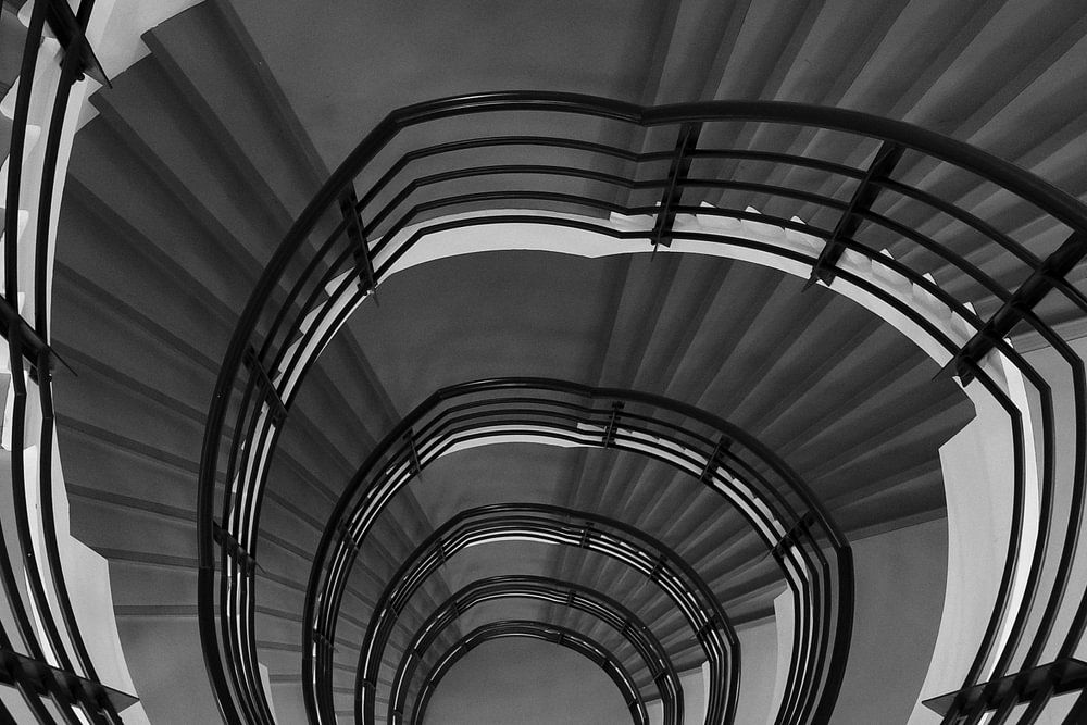 Draaitrap met een fraai ontwerp, in het gebouw van Spaces, aan de Amsterdamse Zuidas.