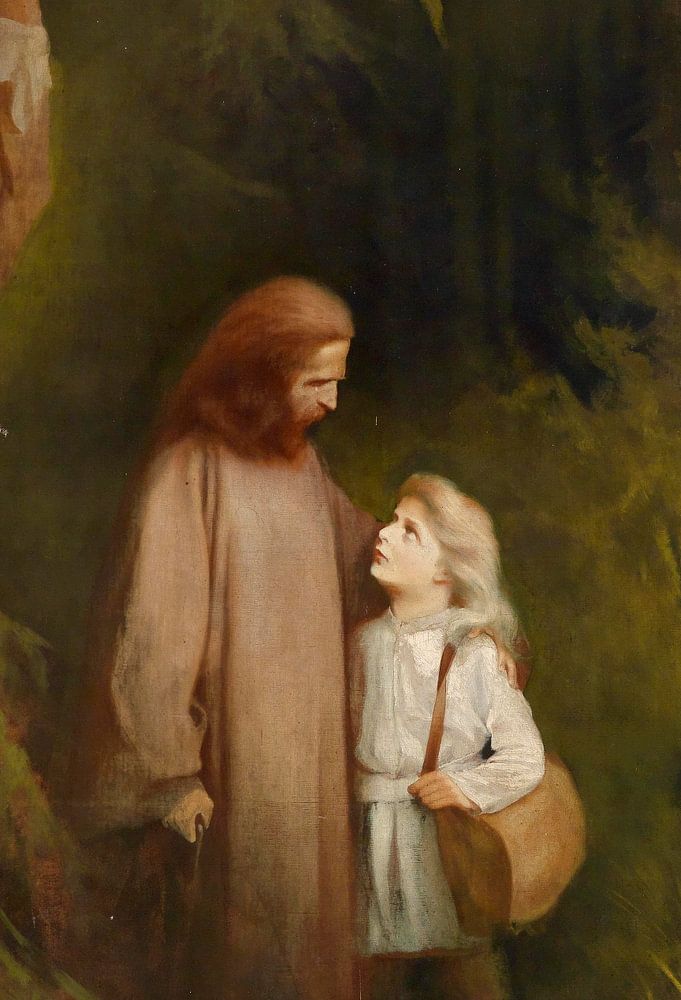Under an image of Jesus Christ, a man and a child say goodbye in the natural setting of a forest.