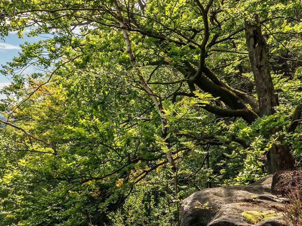 What a beautiful tree that stretches here towards the light. What a beautiful green it still carries, although it is already late summer. What an idyllic view one can enjoy sheltered under its crown. No hill, no mountain does not seem to lie under a dense forest, only a few man-made aisles cloud the picture. But we concentrate on other things, the sun, the smells, the warm rocks. Simple but beautiful.