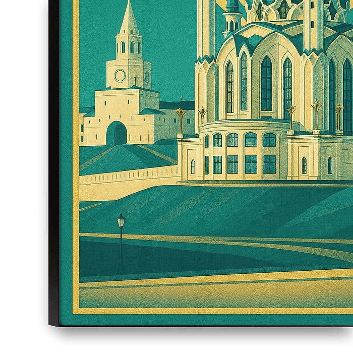 Discover the unique architectural harmony of Tatarstan with this vibrant travel poster of Kazan. The artwork centers on the breathtaking Kul Sharif Mosque, with its soaring turquoise-tipped minarets and brilliant white facade. Located within the historic Kazan Kremlin, the mosque is depicted here as a shining jewel against a teal…