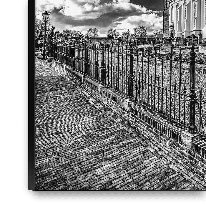 Het historische kerkje van de Friese plaats Dronrijp ligt op n terp gesitueerd in het oude dorpsmidden. Afbeelding in zwart/wit.