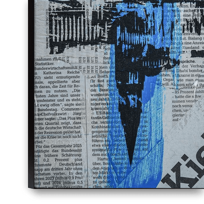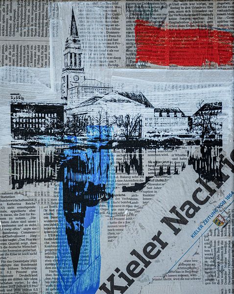 This work combines an analogue collage with screen printing to create a multi-layered homage to Kiel. It is based on clippings from a Kiel newspaper, which have been assembled into an urban texture – fragments of news, stories and everyday life. Overlaid on top of this, using the screen-printing process, are graphic motifs from Kiel.…