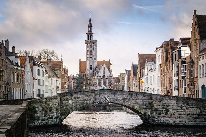 This photograph shows the King's Bridge with Jan van Eyck Square and the striking Poortersloge (Burgher's Lodge) behind it. The arch of the stone bridge forms a natural frame for the canal, while the symmetrical composition of the image naturally draws your gaze to the heart of the city. The slender tower in the background provides…