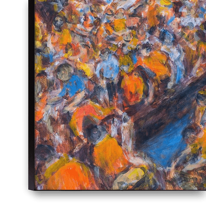 Impressionistic, colourful, cheerful painting of celebrating King's Day on the canals of Amsterdam. Orange partygoers celebrate the birthday of King Willem Alexander. The moat is coloured orange by the partying crowds in their boats.