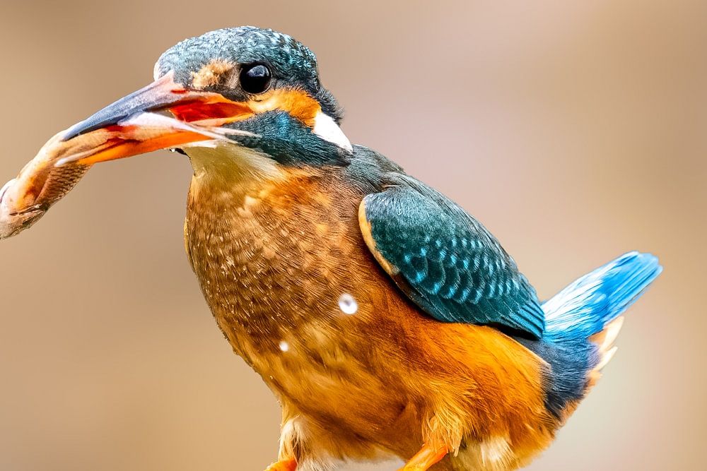 Buy this bird art Kingfisher on branch with freshly caught fish by Gianni Argese on canvas, ArtFrame, poster and wallpaper, printed on demand in high quality.
