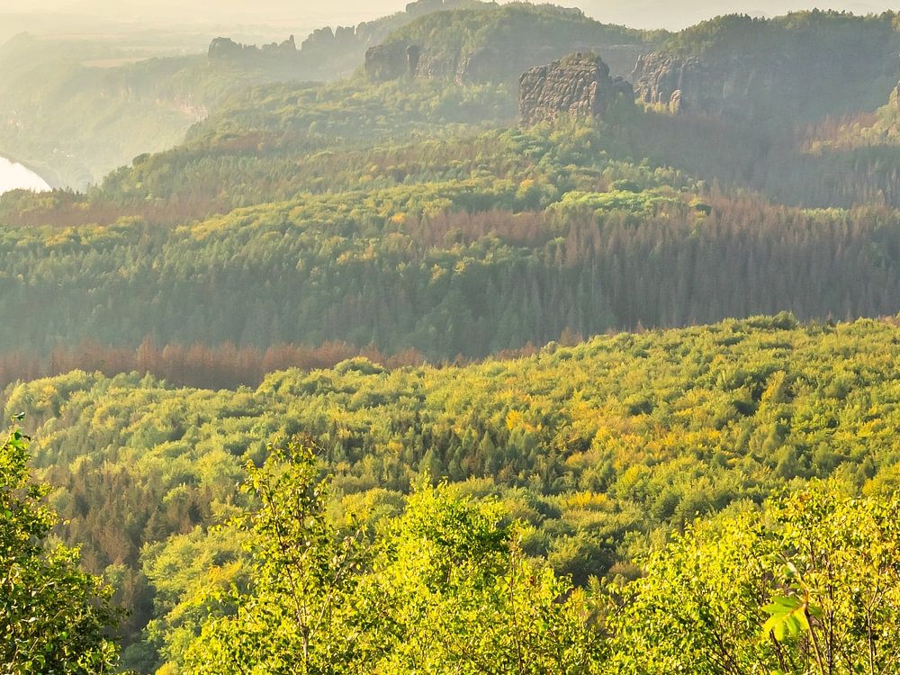 Similar to the Carolafelsen, a beautiful and extremely characteristic view awaits the hiker here at the Kipphorn. The Elbe marks the lowest point, all around valleys and rocks provide a clear landscape profile. Above all, the long mountain ridge, starting at the Schrammsteine and continuing to the Großer Winterberg, shapes the picture.