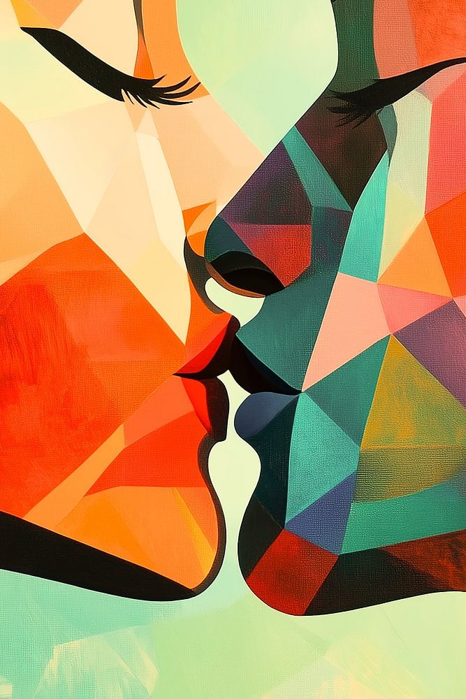Colourful portrait of two abstract women consisting of geometric shapes kissing