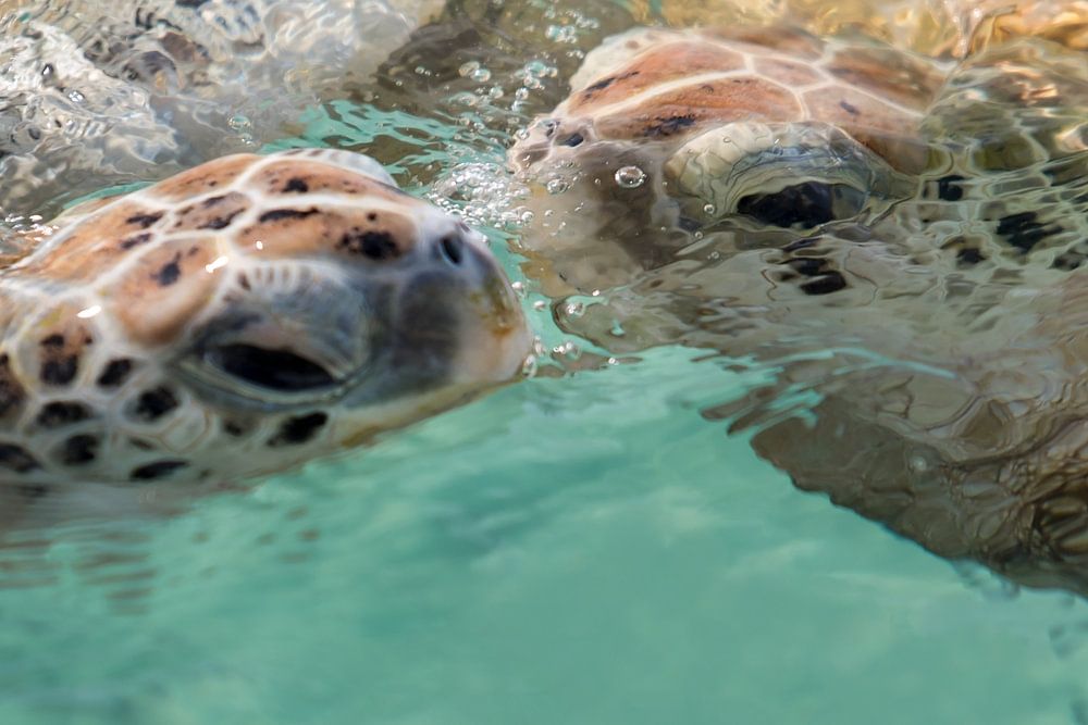 Turtles who almost seem to be kissing each other in Playa Mujeres, Mexico