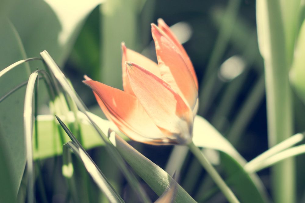 Een tulpje tussen al het groen gefotografeerd in de Keukenhof. Dit mooie kleine tupje stond tussen vele grotere bloemen. Daarom viel deze op.