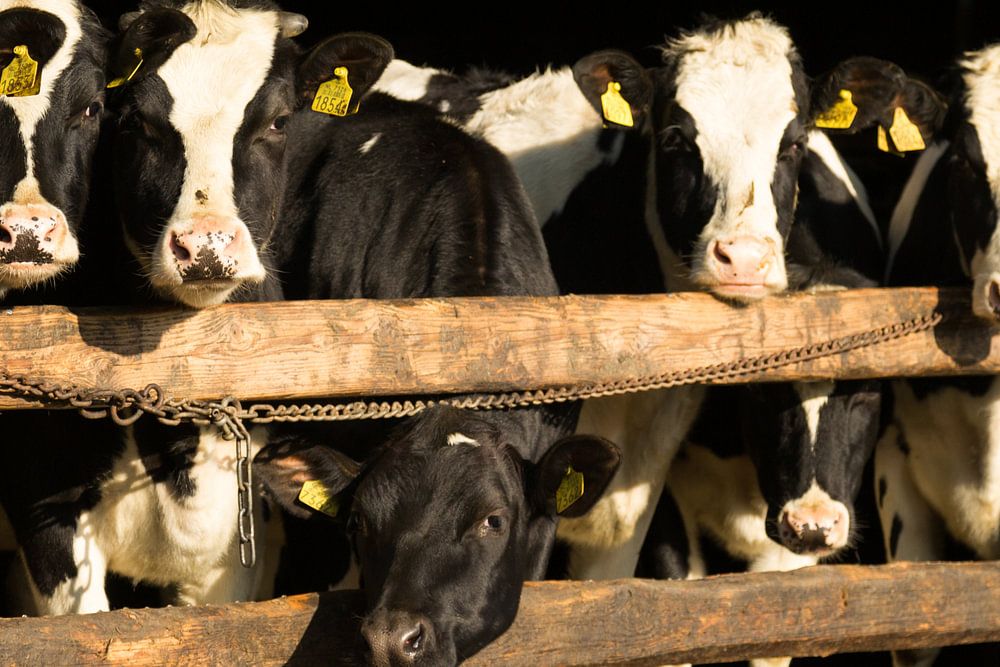 Koeien kijkend verlangend naar buiten bij de ingang van de stal. Ze lijken de lente te proeven en naar de wei te willen.