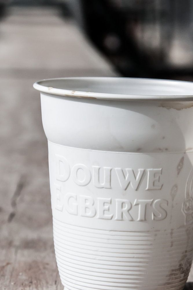 Op een stijger bij de bouwplaats hadiemand zijn kopje koffie laten staan. Het bekertje was al leeg, de pauze was dan ook al voorbij.