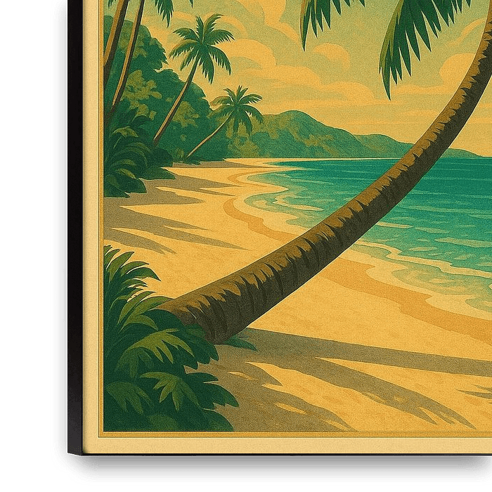 This artwork captures the tropical warmth and peaceful charm of Koh Samui, one of Thailand’s most beloved island destinations. The scene opens onto a golden shoreline lined with lush palm trees, the centerpiece being a tall, elegant palm leaning gracefully toward turquoise waters. Soft waves gently wash across the sand, while distant…