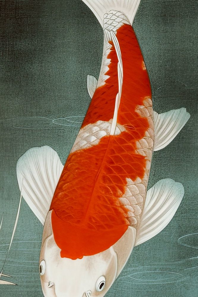 The image shows an artistic rendering of a koi carp, executed in a style reminiscent of traditional Japanese prints.