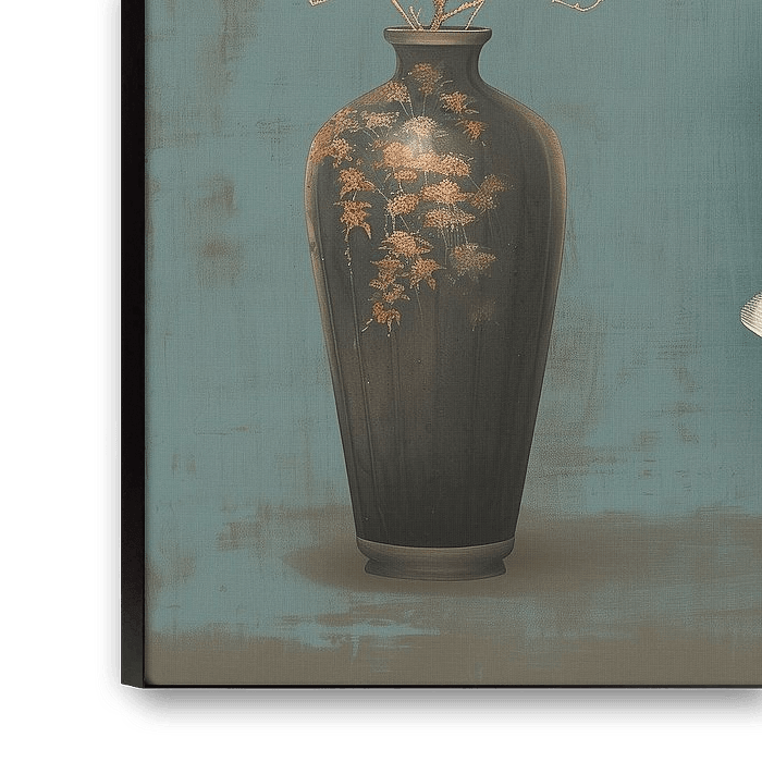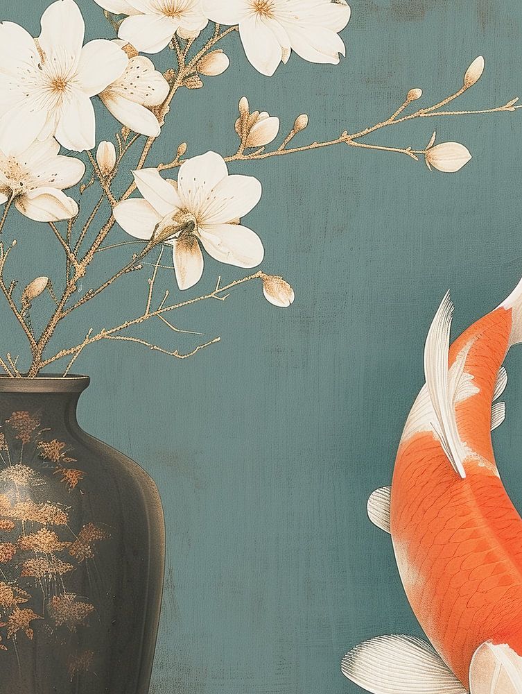 A soothing painting of a koi carp next to a flower vase. Zen fish.