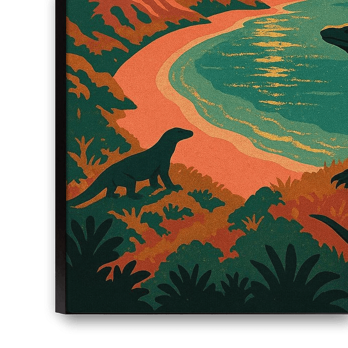 Step into a prehistoric world with this vibrant vintage-style poster of Komodo National Park. This striking artwork captures the wild, rugged beauty of the islands, featuring the legendary Komodo dragons roaming freely on the shore. The illustration highlights the unique "Pink Beach" (Pantai Merah), contrasting the soft salmon-colored…