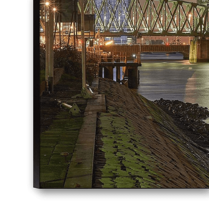 One of the city icons is this old (1927) railway lift bridge over the Koningshaven. Beautifully lit and a feast for the eyes. In the background the illuminated Erasmus Bridge. Old and new united in this cityscape in the evening light.