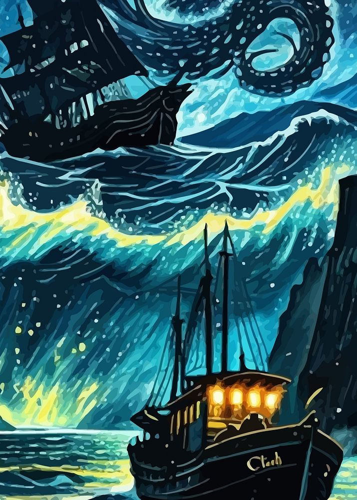 This piece captures the raw fear and mythic scale of the Kraken legend—an ancient sea beast rising from the abyss to reclaim its dominion. The horror lies not in blood, but in the vast, unstoppable power of nature and the unknown. Perfect for collectors of nautical mythology and dark fantasy, the artwork evokes awe and dread in equal measure. It’s an unforgettable visual storm, filled with energy, motion, and the ancient fear of the deep.