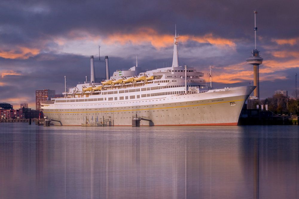 Digital artwork of the ssRotterdam also known as La Grande Dame with another Rotterdam icon in the background: the Euromast.