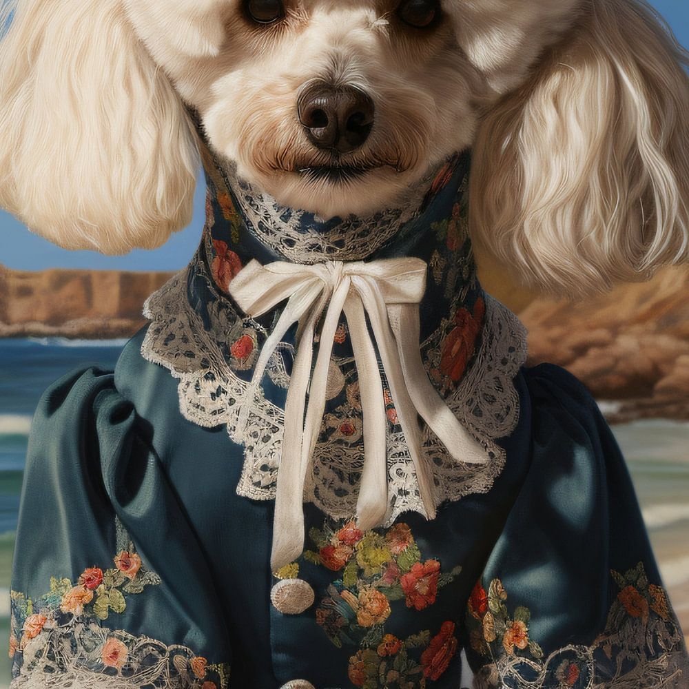 Betreed een tijdloos tafereel met een Labra Doodle gekleed in traditionele Spaanse kleding, genietend van het strand. Dit kunstwerk combineert de vreugde van een Labra Doodle met de sfeer van een traditionele kunstvorm. Een meesterlijke samensmelting van karakter en kunst aan de Spaanse Kusten.