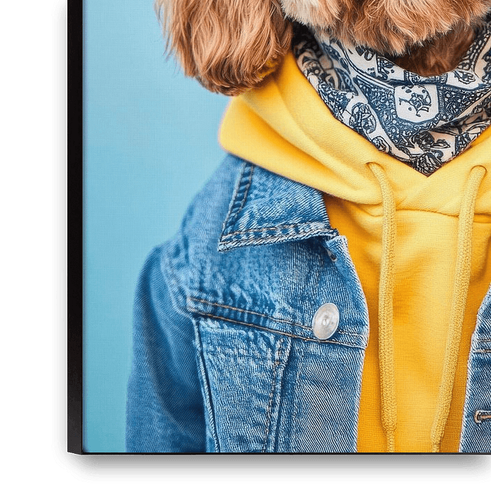 A charming Labradoodle radiates coolness with its curly, golden fur and stylish sunglasses. In a casual combination of denim jacket and bright yellow hoodie, he shows that he is not only cute but also trend-conscious. His chic neckerchief rounds off the look perfectly and transforms him into the hipster among dogs.