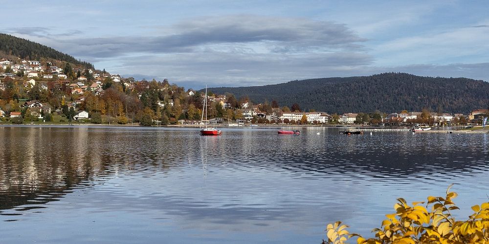 The tranquil waters of Lac de Gerardmer in the Vosges, France, reflect the stunning autumnal hues of the surrounding mountains and sky. The picturesque setting of Chemin du Tour du Lac offers a serene escape into nature. Yellow autumn leaves in the foreground provide a vibrant contrast to the tranquil waters of the lake in the beautiful Vosges region of Eastern France. Landscape panorama travel photography, a great souvenir of your trip to France.