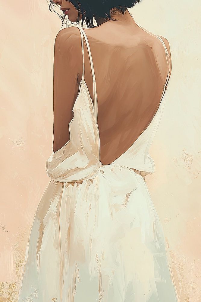 A work of art that exudes elegance and intimacy through the depiction of a figure in a light white dress against a warm beige background. The bare back and short dark hair create a sensual yet understated image. The loose brushstrokes and soft color tones give the work a dreamy, romantic feel.