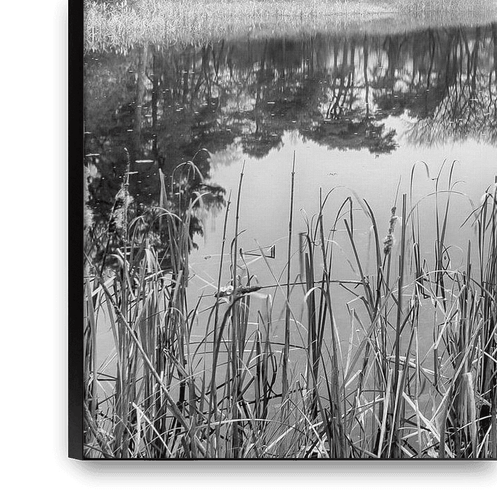 Black and white photo of a pond, and former duck decoy, in the Kombos estate in Maarsbergen, the Netherlands. The trees along the water reflect beautifully in the stagnant water. In the foreground a reed collar with a few reed cigars is visible.