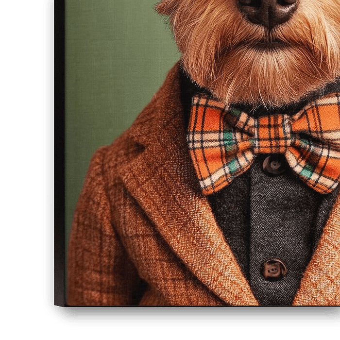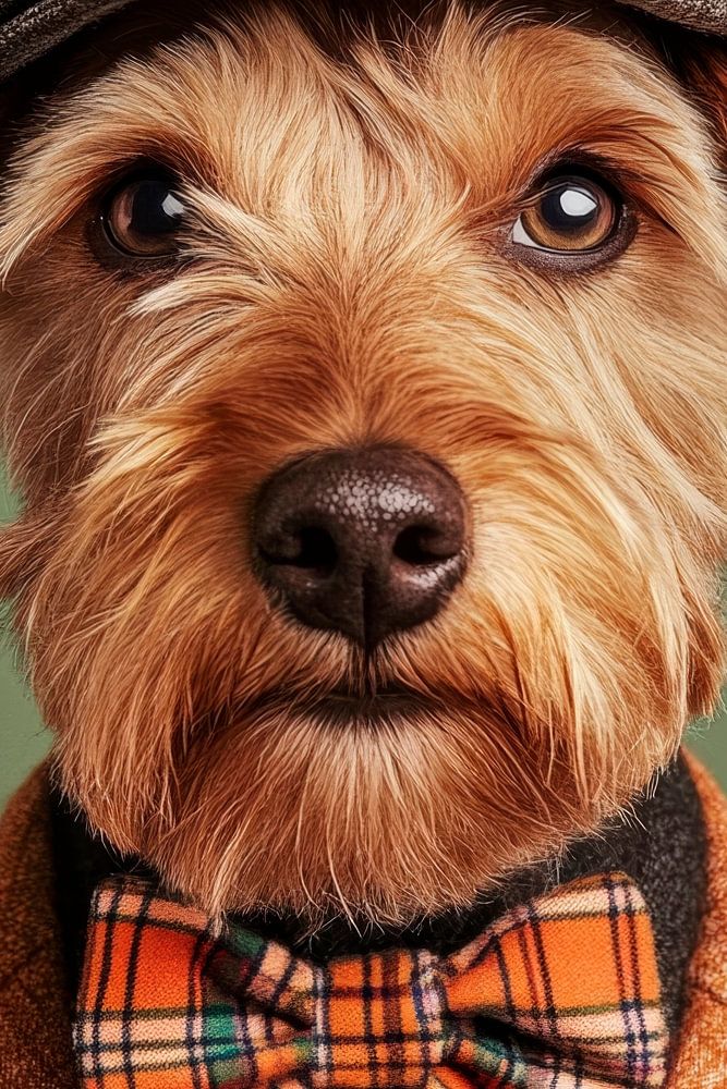 A smart Lakeland Terrier epitomises the perfect gentleman. With his charming, fluffy coat, elegantly styled hat and dazzling bow tie, he radiates a unique charm. His attentive gaze betrays curiosity and intelligence, while the classic suit makes him unmistakable. A cute eye-catcher with a touch of British style!