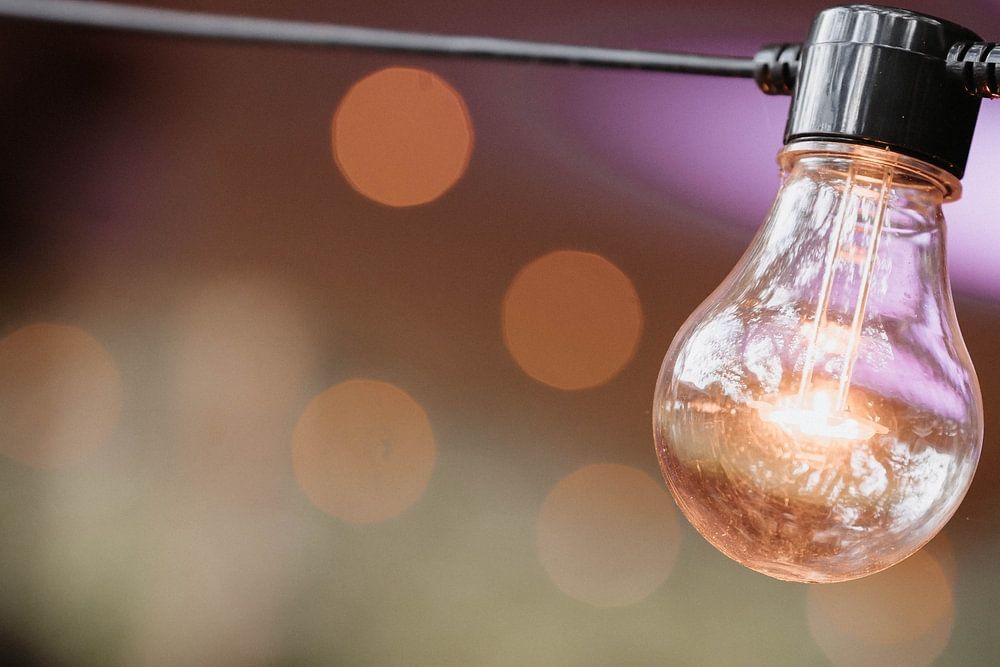 Lamp on a cord with beautiful bokeh in the background. The purple and orange colours give a very warm atmosphere to the image.