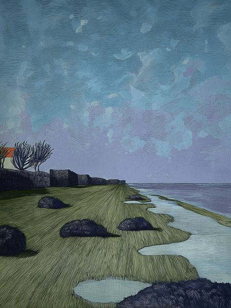 NIRA shows a hushed, abstract landscape in which space, tranquillity and imagination come together. Using simplified forms and open composition, the work balances between recognition and abstraction, without naming a specific place. The artwork is digitally constructed and inspired by traditional materials and graphic techniques, with…