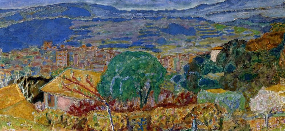 Landscape at Le Cannet is the most ambitious depiction of the world that was central to Bonnard's art in the last decades of his life. The artist sat on the hill above his house, which he had named "Le Bosquet" because of the forest that surrounded it, and looked west toward the Esterel Mountains. The painter places himself in the foreground on the right, next to a couple of goats; on the other side of the canvas, a cow stands among prickly plants. Flooded with warm light and with a rainbow-like array of colors, the painting was intended to decorate the home of a prominent collector on the outskirts of Paris.