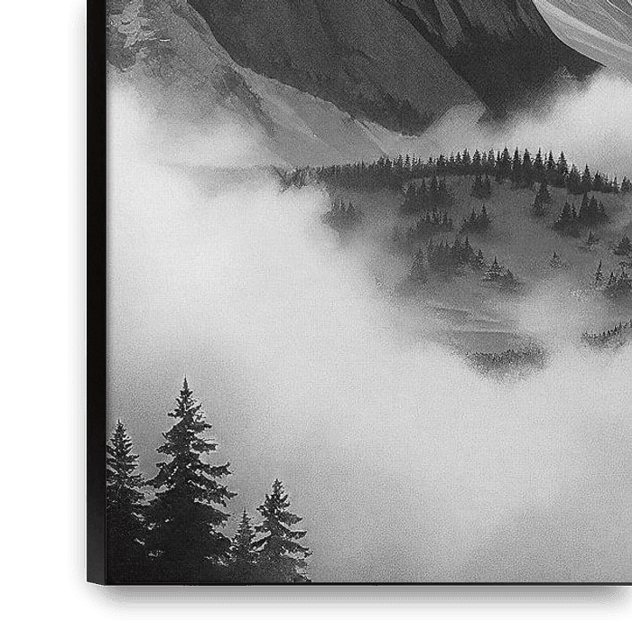 In this picture, which is painted in the style of a painting, a mountain landscape unfolds in powerful black and white. Snow-covered peaks and slopes subtly allude to the changing seasons. At the top, at the very back of the picture, a glacier can be seen, shimmering brightly in contrast to the dark rocks - symbolising permanence and at…