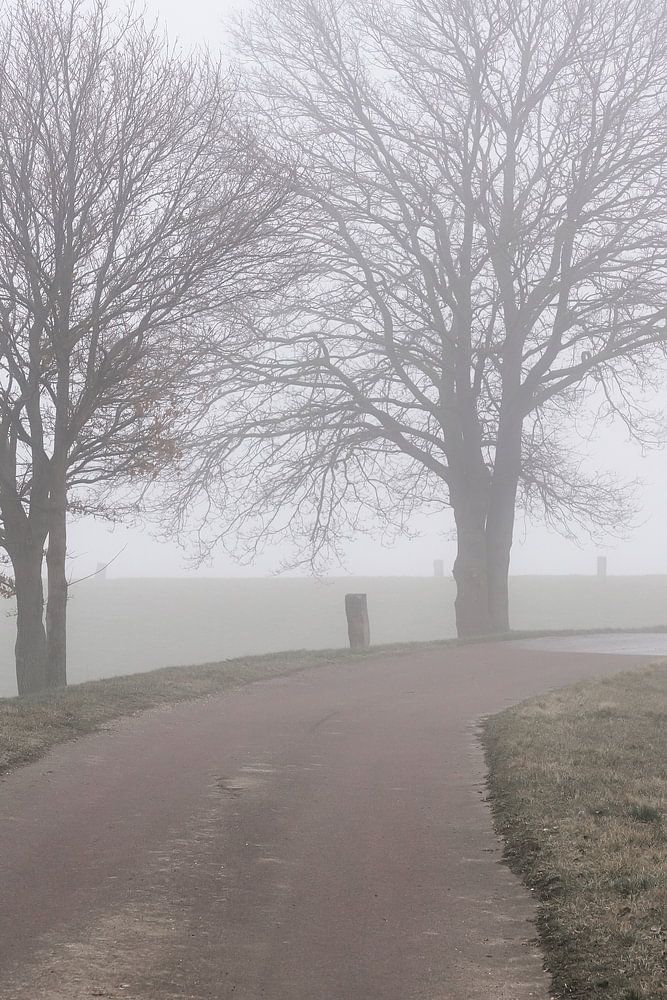 Trees on a lonely country road in the countryside in Germany on a day in the fog