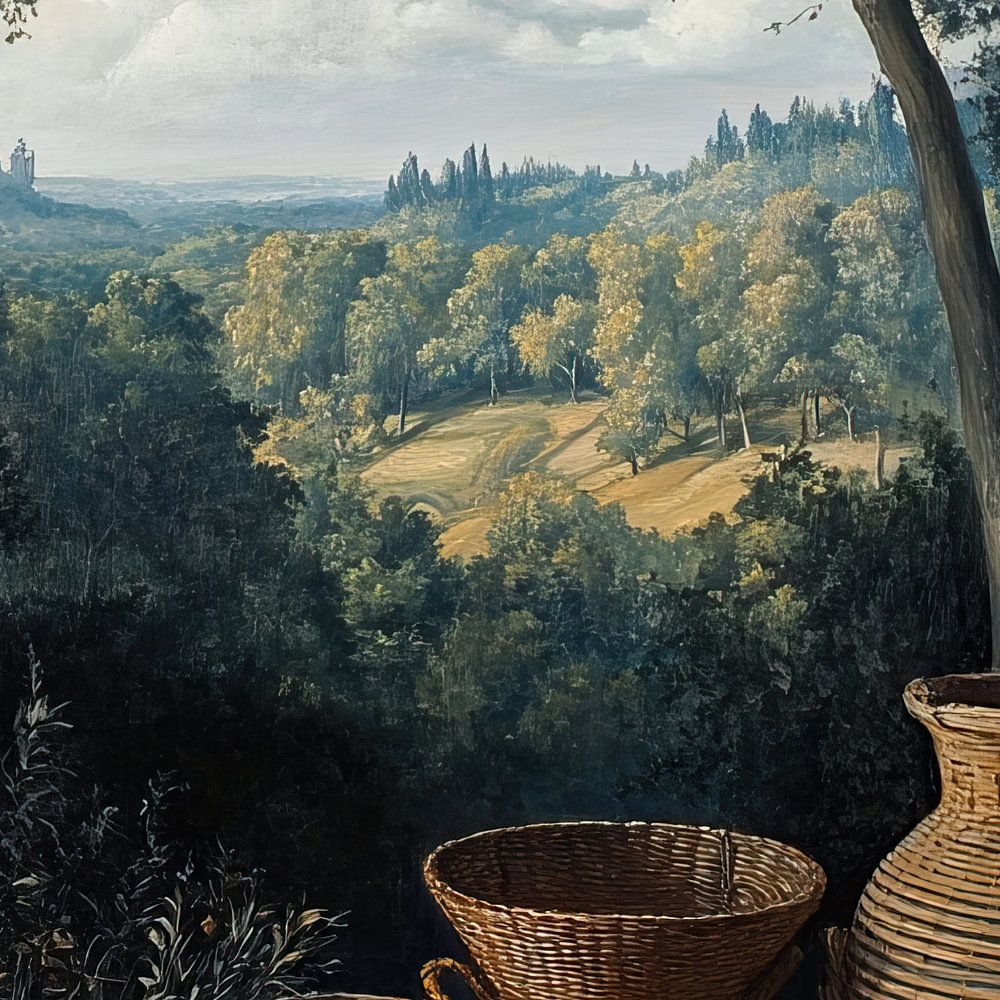 Landscape with Baskets and Trees - This landscape painting shows a beautiful view with a green hilly background and a few baskets of plants, bringing nature to life in a serene setting.